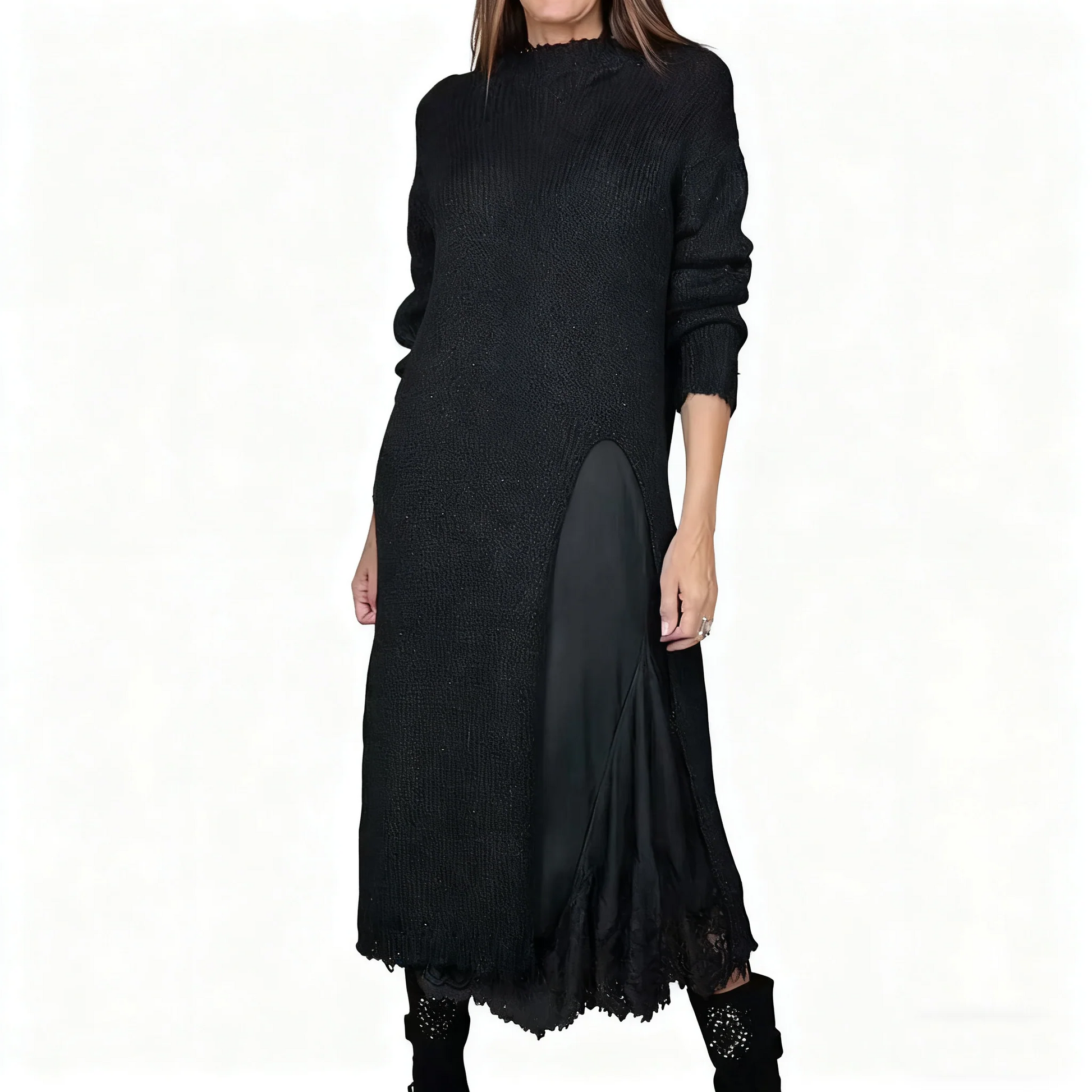 DELICATE LACE ACCENTS: The accompanying spaghetti strap dress features exquisite lace trim details along its hem. These subtle yet luxurious embellishments add a touch of feminine charm and intricate detailing to the inner layer. It ensures the dress looks beautiful on its own or beneath the pullover, enhancing allure.